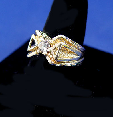 GENTLEMAN'S DIAMOND RING: Round brilliant cut diamond of approx. 1/2ct, measures 5.2 x 3mm, set in 14k yellow gold textured open triangular mount, size 8, 10 grams. Dedicated ''To Robert from Estelle''.