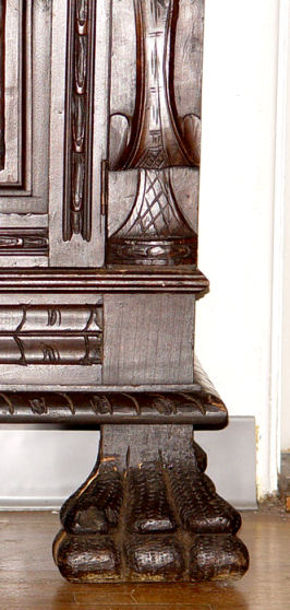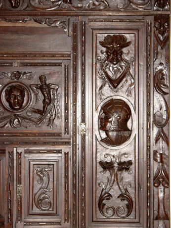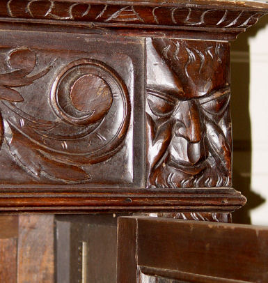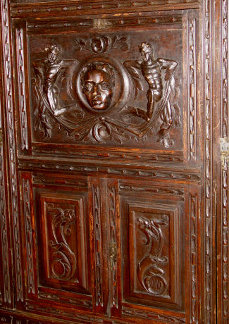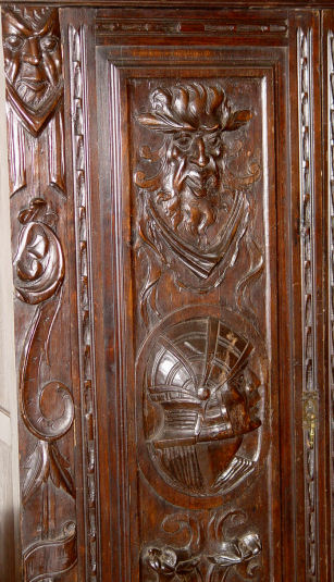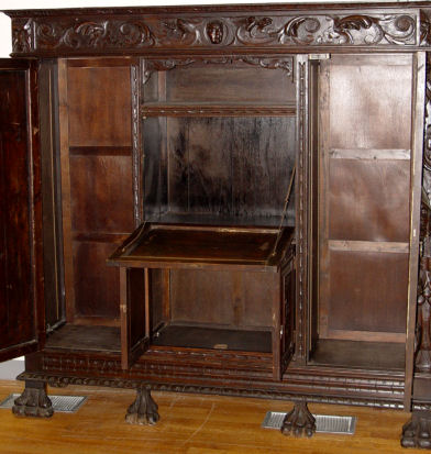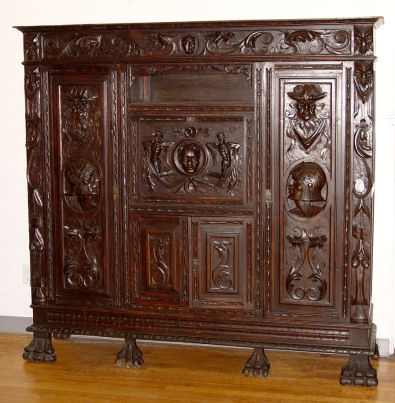 19TH C DRAMATICALLY CARVED SIDE CABINET FIT FOR A CASTLE: Fall front center door with 3'' deep carved masqueron. Side cabinets and center storage. Heavily carved throughout. 69''h. x 69'' x 16''.