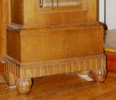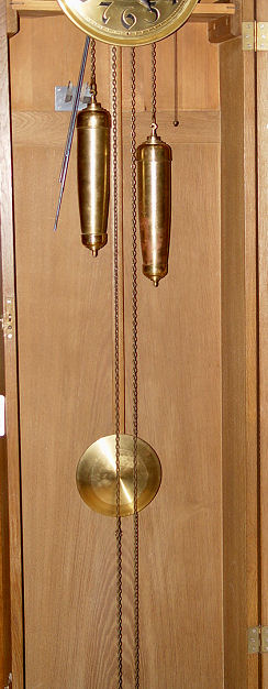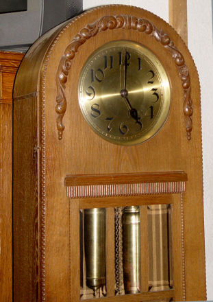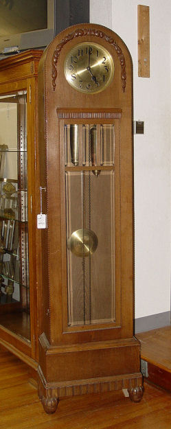 EARLY ART DECO OAK GRANDFATHERS CLOCK: Weight driven, bell gong movement in a dark oak case. Arched top. 82''h. x 18 3/8'' x 9 1/2''.