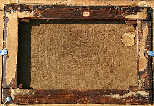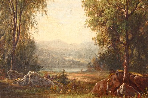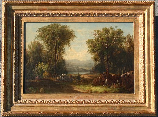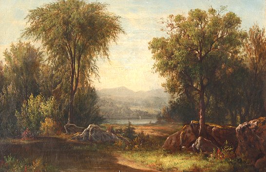 19TH CENTURY HUDSON RIVER SCHOOL LANDSCAPE: Depicts a forest clearing with sailing ships in the distance, O/C, 10'' x 15'', possible signature lower right, comparisons to Casilear and Gary have been made, encased in gilded antiqued early 20th century frame with wear, 15 1/2'' x 20 1/2''. Condition - Needs cleaning, mild craquelure, several minor abrasions with pinpoint paint fleck and one puncture with repair in the upper left quadrant.