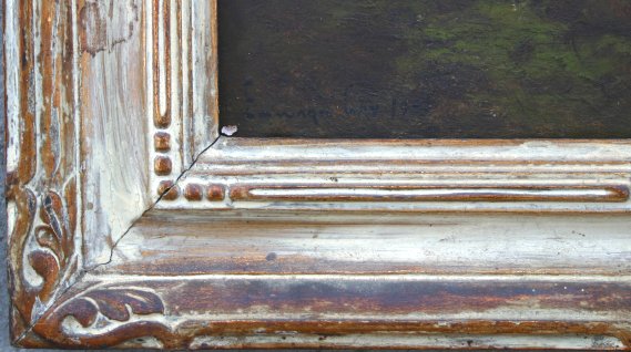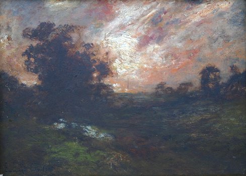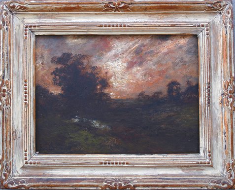 GAY, Edward, (American, 1837-1928): Pastoral sunset, O/Panel, 11'' x 16'', signed lower left, encased in carved frame with wear, 16 3/4'' x 20 3/4''. Condition - Needs cleaning, several minor abrasions.