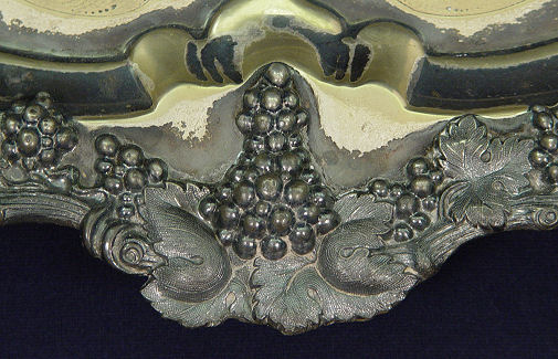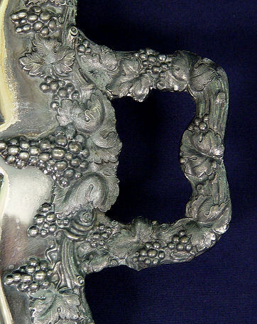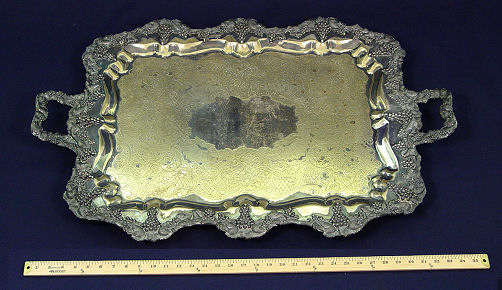 GIGANTIC HEAVY GRAPE BORDER SILVER PLATED TRAY BY BARBOUR SILVER CO: 3' x 2' including handles. Highly detailed grape border, raised on scrolled feet. Impressed BSCEP and stamped with Barbour hallmarks. Please call for condition.