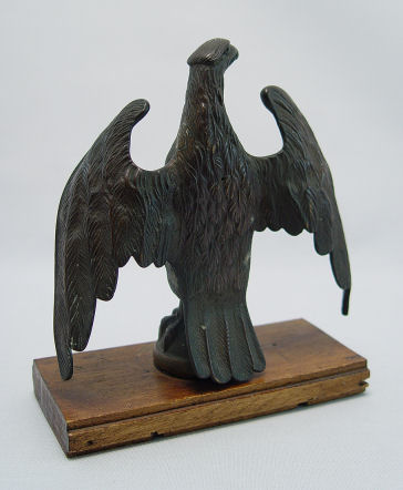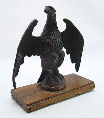 EARLY BRONZE EAGLE SCULPTURE: Affixed to crude wooden plinth, 6'' h., good patina, possibly from a clock garniture, restorations to legs.