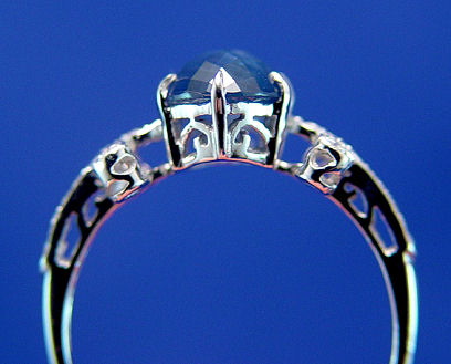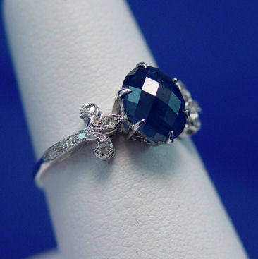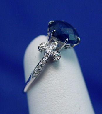 1.88CT BRIOLETTE CUT SAPPHIRE RING: Delicate ring of 14k white gold centered by a briolette cut sapphire of approx. 1.88ct, accented with diamonds in fleur de les shoulders, size 6.75, 1.6 grams. Est. $300/400**