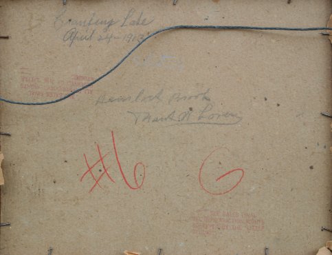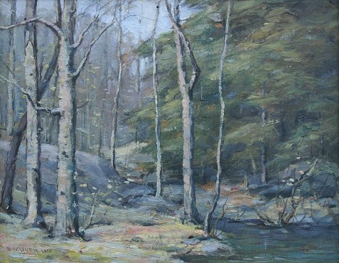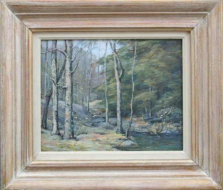 LOVEN, Frank W., (American, 1868-1941): ''Hemlock Brook, Brassberry Lake, April 24, 1913'' O/B, 8'' x 10'', signed lower left and dated, also, signed and titled verso, vintage gilded antiqued frame, 12 1/2'' x 14 1/2''. Condition - Pinhole in upper margin.