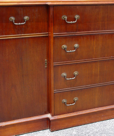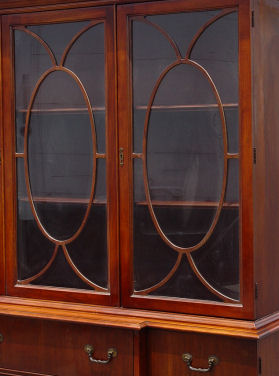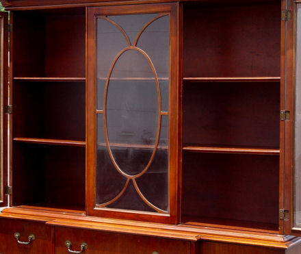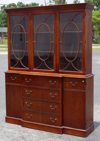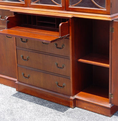 MAHOGANY BREAKFRONT SECRETARY CHINA CABINET: Upper section of book or china shelves do have plate grooves. Lower section has the center fall front drawer pigeon hole desk. Drawer and side cabinet storage. 77 1/2''h. x 60'' x 16''. For shipping info- it is in two parts.
