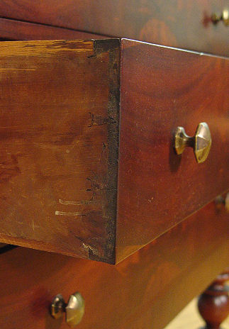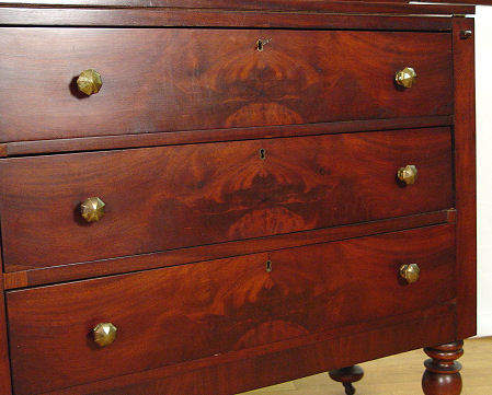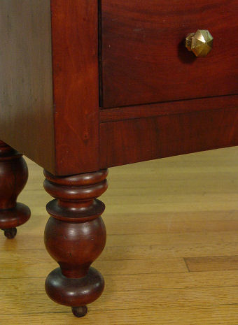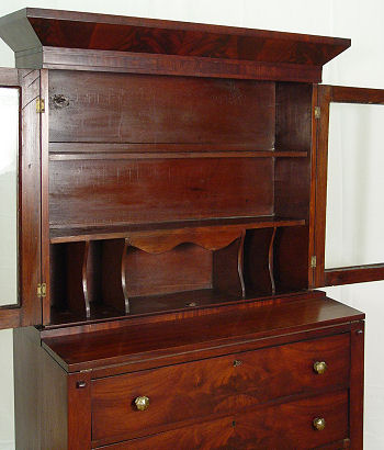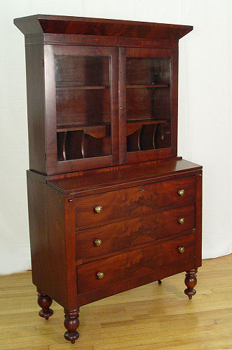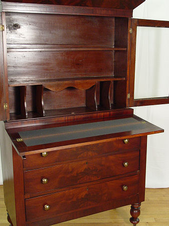 19TH C MAHOGANY SECRETARY BOOKCASE: Mid 1800's three drawer chest with flip out writing surface, the upper section of the cabinet is a glass front bookcase with lower shelf divided into letter slots. Turned ball feet. Board panel back. All original.