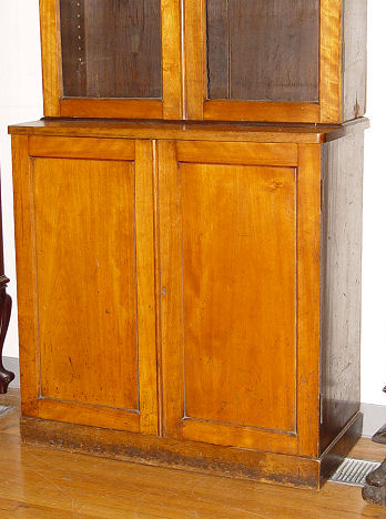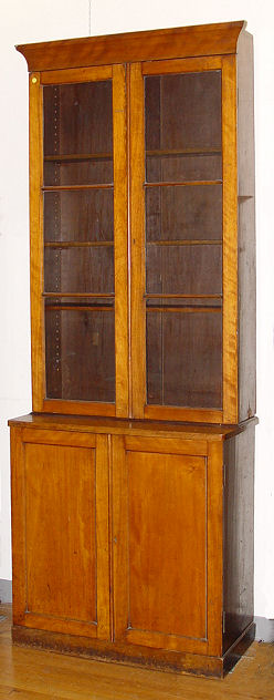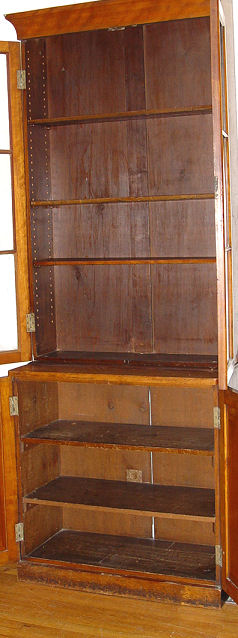 EARLY 1800'S STEPBACK BOOKCASE CABINET: Upper section has glazed doors, adjustable shelving, straight cornice. Lower section is a double door cabinet. One inch shy of 8' tall x 35''w x 16 1/2''.
