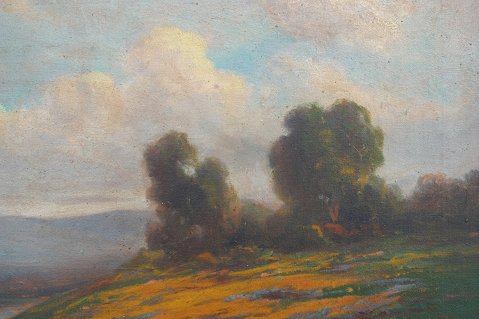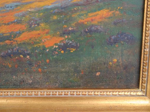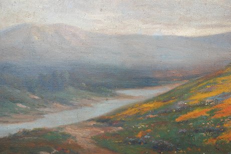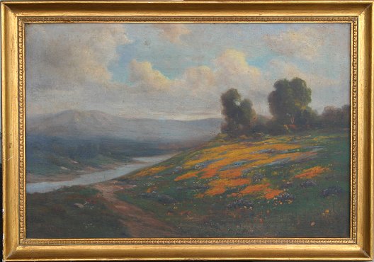 GRAY, Percy, Attribution, (American, 1869-1952): Lupine, poppies and oaks in a river valley, O/C, 20'' x 30'', encased in a gilded frame with wear, 23 1/2'' x 33 1/2''. Condition - Re-lined, over cleaned, areas of thin paint, several flecks of paint missing, several minor abrasions, needs further cleaning, several touches of in-paint. Est. $3000/5000**