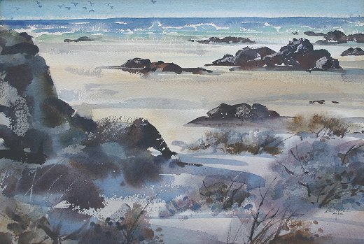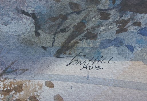 HILL, Thomas, (American, 1925-): California coastal beach scene, W/C, 14 1/2'' x 21 3/4'', signed lower right ''Tom Hill, AWS'', worn gold frame 21 1/2'' x 28 1/2''. Condition - Will need new matting, some overall browning to the image.