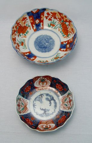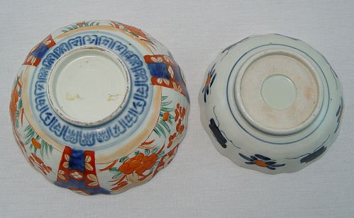TWO IMARI BOWLS: One larger than the other. Iron red, green, and cobalt decoration on ribbed bodies. Unmarked. 7 1/4'' dia. x 3'' deep and 6'' dia x 1 7/8'' deep.