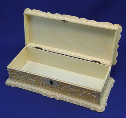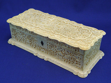 ORIENTAL CARVED IVORY GLOVE BOX: Intricately carved hinged box with shaped and scalloped over hanging top and base. Each panel delicately carved with a different and evolving genre scenes. Top centered by the genre scene and edged in floral and foliate band. Dove tailed construction, original hinges and lock mechanism, no key, please note slight curvature to lid, some cracking and seam separation. Overall 3''h, 10 3/4'', 4 7/8''. Est. $500/700**