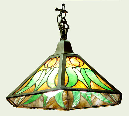 ARTS AND CRAFTS LEADED GLASS HANGING CEILING LIGHT: Six panel conical shade in green and amber tulip design. 3 light sockets. The panels are 8''l, the chandelier is 17'' dia. Please call for condition.