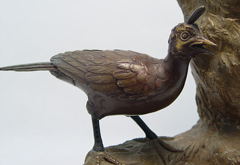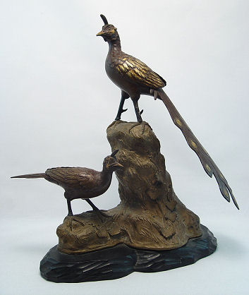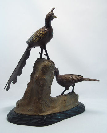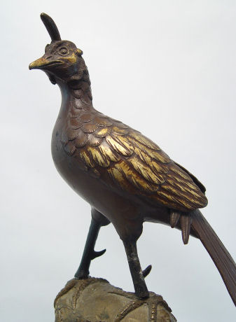 19TH CENTURY ORIENTAL BRONZE GROUPING OF PEACOCKS: 14'' h., signature to base, affixed to carved wooden plinth. Condition - Minor wear to patina, repairs to bird's legs.