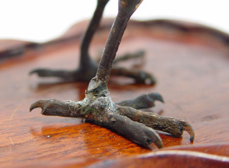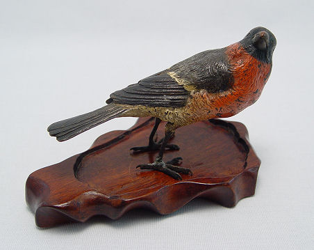 GOOD COLD PAINTED BRONZE SCULPTURE OF A BIRD: 3 1/8'' h. x 5'' w., no visible signature, affixed to carved stand. Condition - Repair to legs, some paint loss throughout.