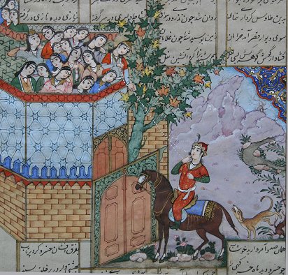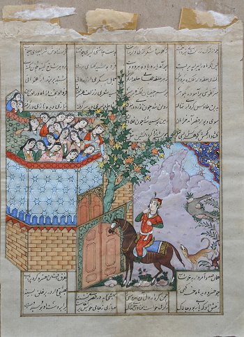 INDIAN/PERSIAN? ILLUMINATED MANUSCRIPT: Scene depicts a young male on horseback gaining admittance to a harem, probably 19th century, painted on velum type paper, hinge mounted, measures 8'' x 6 1/2'', minor wear throughout.