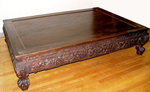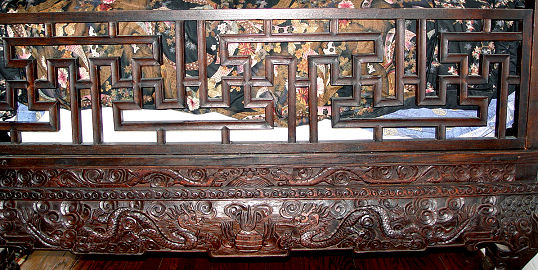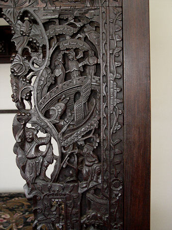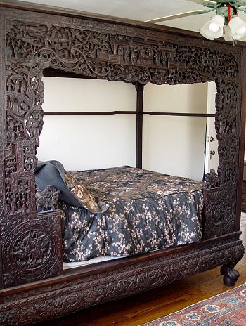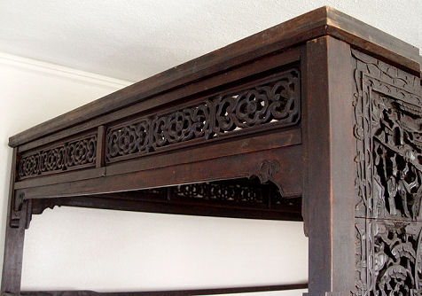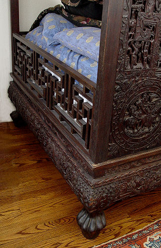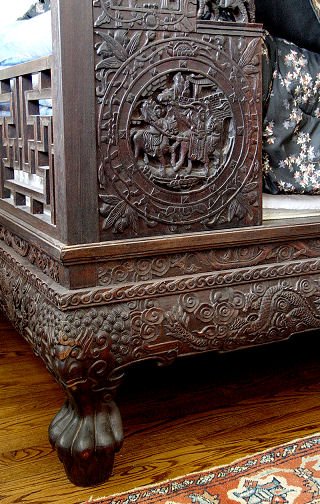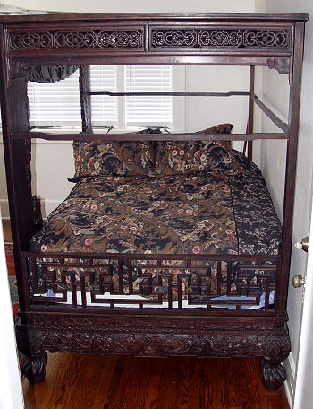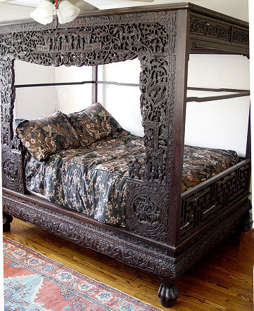 19th C CHINESE CARVED ROSEWOOD CANOPY WEDDING BED: Highly detailed, deep and pierced carvings. This fine piece will break down and reassemble. The full size linens and mattress are included. 81 3/8''h x 61'' x 84 ½''.