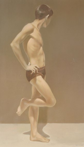 BLISS, Robert, (American, 1925-1981): Standing boy athlete, O/Masonite, 35'' x 21'', signed lower right and dated, matching thin edge frame. Condition - Several abrasions in the left margin.