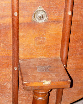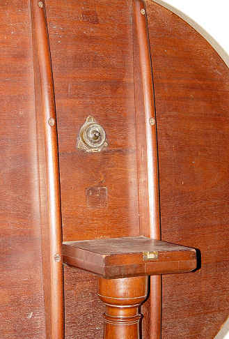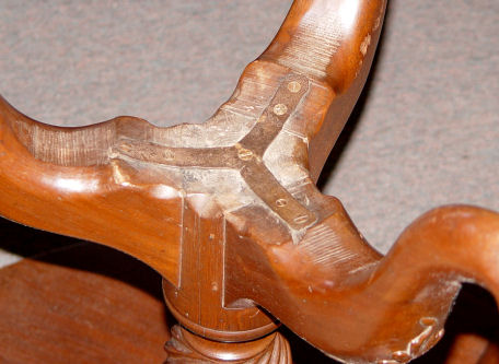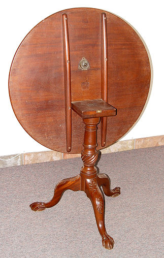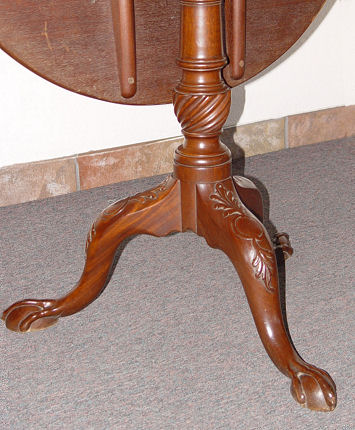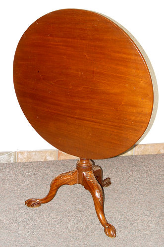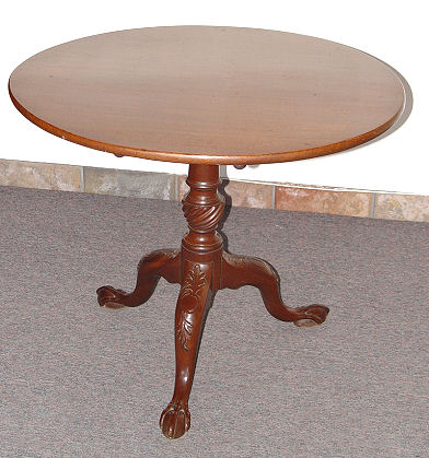 EARLY MAHOGANY TILT TOP TABLE: Late 18th century. Carved knees on tri legged base, legs ending in rats paw feet. Approximately 27''h x 32''dia at its widest point. Metal strap to tri-pod base.