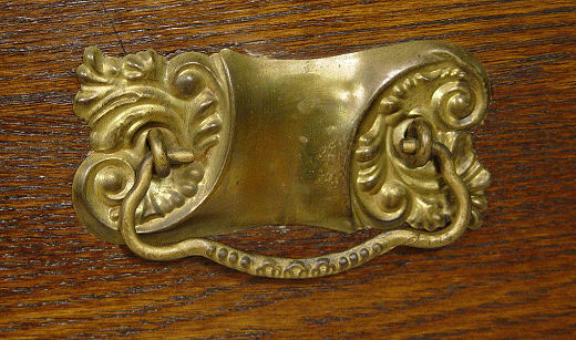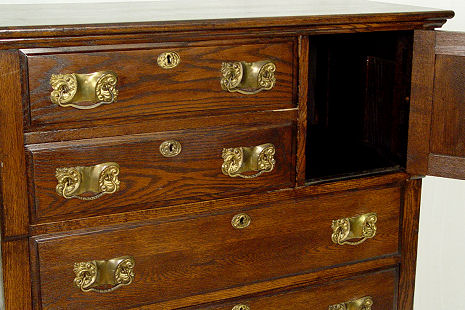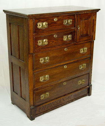CA 1900 CHESTNUT GENTLEMEN'S CHEST: Five drawers plus a hat box. Ornate brass pulls, paneled sides. Stained dark to resemble oak. 45''h. x 40''w. x 19 1/2''.