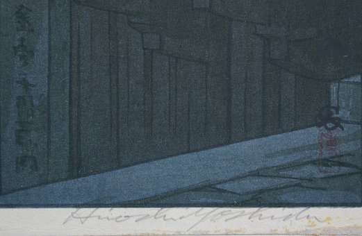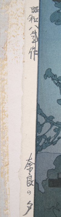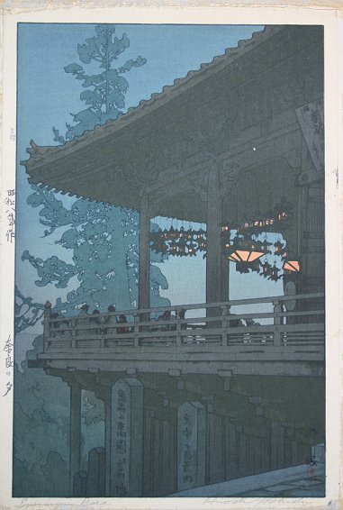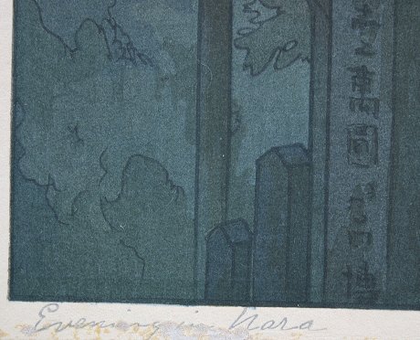 YOSHIDA, Hiroshi, (Japanese, 1876-1950): ''Evening in Nara'', Woodblock, 15 3/4'' x 10 1/2'' with margins, pencil signed lower right, title stamped lower left. Condition- Laid, with some glue residue in margins.