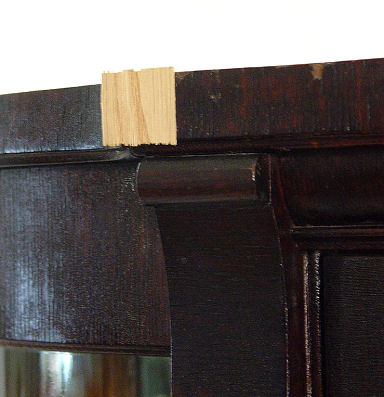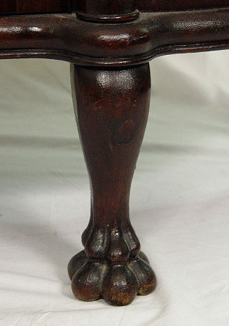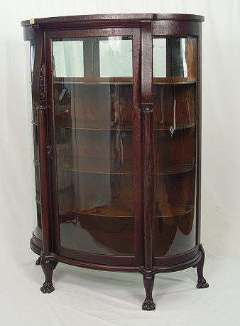 TURN OF THE CENTURY OAK BOW FRONT CHINA CABINET: Columnar columns, carved paw feet. Mirror back upper shelf, plate rails. 66 1/2''h. x 45'' x 17 1/2''.