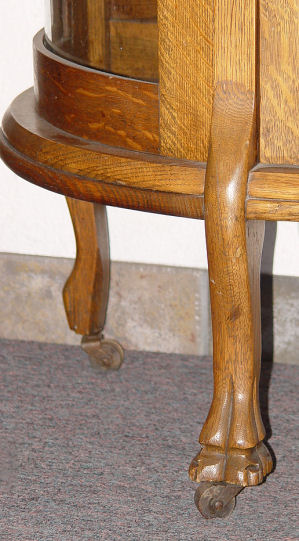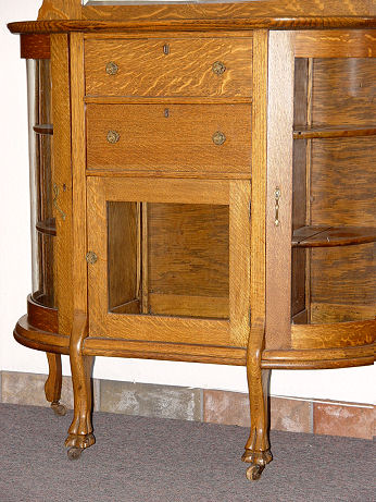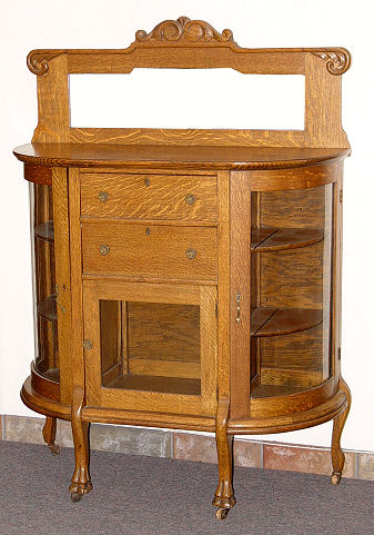 GOLDEN OAK SIDEBOARD CHINA CABINET: Curved glass sides show off curios, the center has two drawers over glass front display. Carved crest over beveled mirror. 55 1/4''h., x 40 1/4'' x 16''.