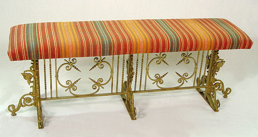 EDGAR BRANDT ERA WROUGHT WROUGHT IRON BENCH: The base of the bench is gilt iron with ornate scrolls to the legs being gilt metal. Upholstered seat, 19'' x 49''l x 13''w