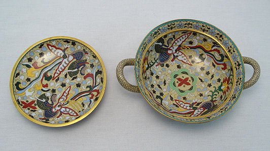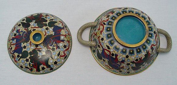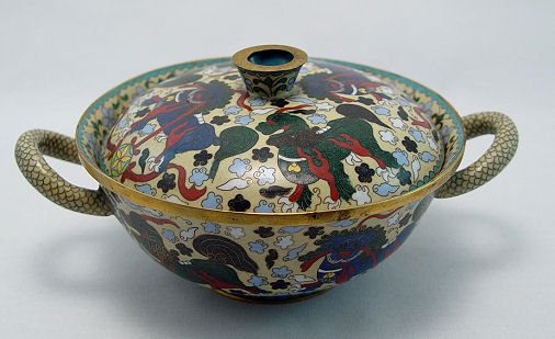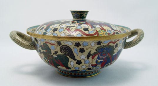 CLOISONNE COVERED BOWL: Mythical horse design, scale design loop handles. 4''h, 6 1/2'' dia.