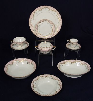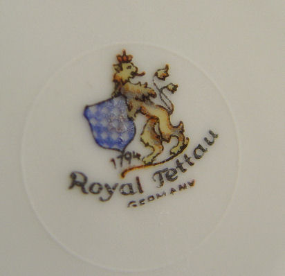 LARGE SERVICE OF ROYAL TETTAU FINE GERMAN CHINA: 77 pieces to include 11 dinner plates, 12 soup bowls, 19 dessert or bread plates, 19 coffee cups and saucers, 13 demi cups and saucers, a round serving bowl, oval serving bowl, and a covered sugar bowl.