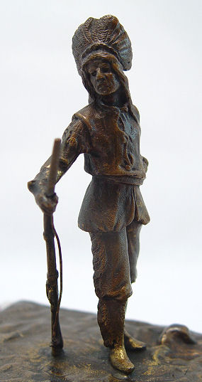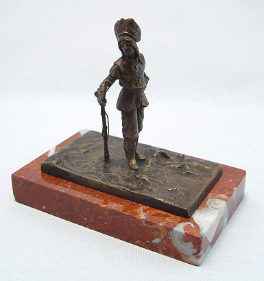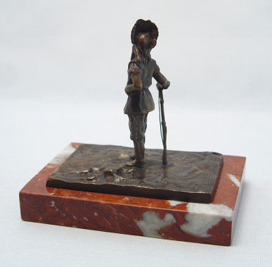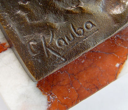 FIGURAL BRONZE INDIAN SCULPTURE SIGNED ''C.KAUBA'' POSSIBLY CARL KAUBA: Affixed to pigeon blood red polished marble plinth, measures 4'' h., signature to base.