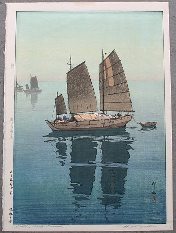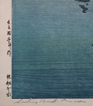 YOSHIDA, Hiroshi, (Japanese, 1876-1950): ''Sailing Boats - Forenoon'', Woodblock, image size 20'' x 14'', 21 1/2'' x 15 1/2'' with margins, stamped signature lower right and titled lower left, encased in black frame, matted, 25'' x 19 1/4''. Condition - Light mat marks, tape residue upper margin, pin hole upper left corner.