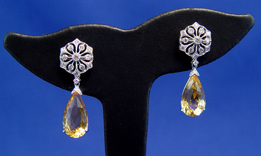 18K CITRINE AND DIAMOND EARRINGS: Two pair for the price of one in these lovely earrings. Floral motif diamond encrusted posts earrings with hidden hook to support the pear shaped citrine dangles. Approx. 1/2ct total of diamonds, and 10.62 ct total of citrines. 18k white gold, large backs, 1/2'' diamond tops only, 1 1/4'' overall with dangles, 7 grams. Est. $800/1000**