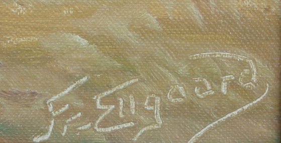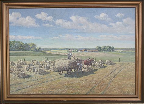 ELLGAARD, Fredrick, (Scandinavian, 20th C): Haying scene, O/C, 26 1/2'' x 38 1/4'', signed lower right, worn gold frame, 31'' x 42 3/4''.
