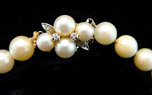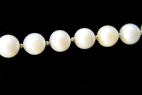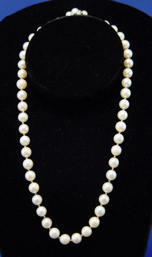 17 1/2'' CULTURED PEARL NECKLACE: Strand comprised of 46 approximately 8mm pearls terminated by 4 pearl gold and diamond clasp.