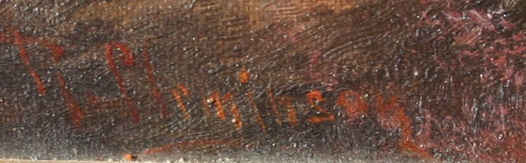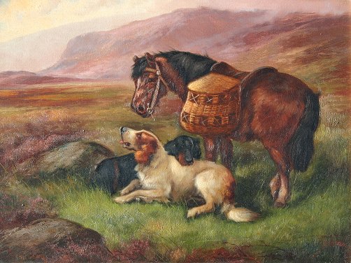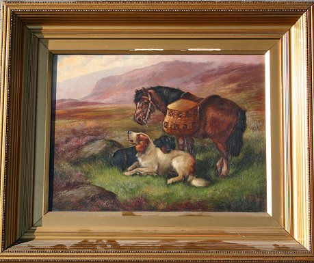 CLEMINSON, Robert, (British, 19th/20th C): Dogs and pony in a highland landscape, O/C, 12'' x 16'', signed lower left, encased in period gilded frame with wear, 19'' x 23''.