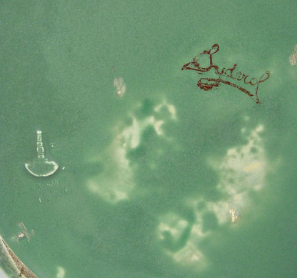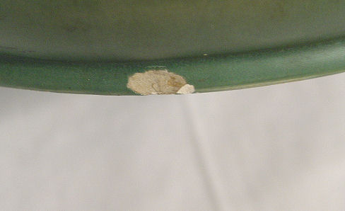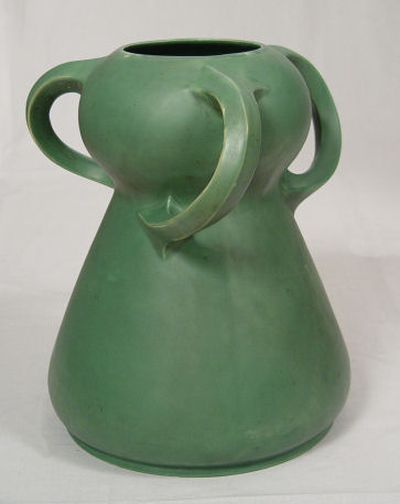 LARGE JULIUS DRESSLER BYDEROL ART POTTERY VASE: Arts and Crafts era, Teco pottery style, green matt glaze vase with a trio of curved handles. Ca. 1900-1945. Small base chip. 15''h.