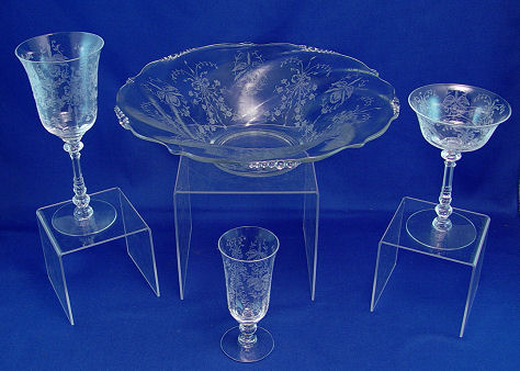 12 PIECE GROUP OF HEISEY ''ORCHID'' ELEGANT GLASS OF THE DEPRESSION ERA: To include 8 champagne stems (6 1/8''h), 2 goblets (8 1/4''h), a juice (5 3/8'') and a bowl (12 1/2'' dia). No chips or cracks.