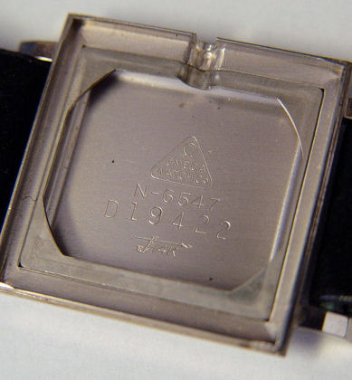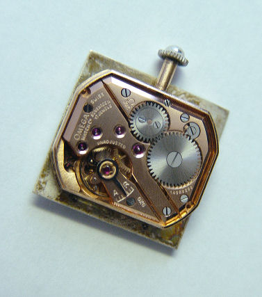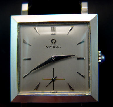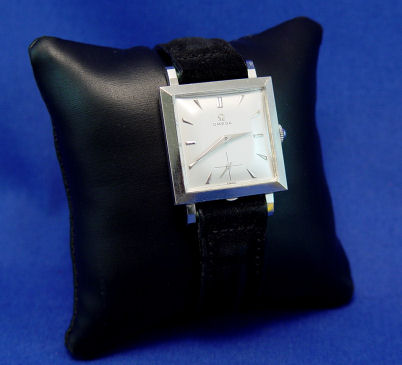 GENTLEMAN'S SQUARE OMEGA 14K WRISTWATCH: Second sweep at 6 o'clock spot, 14k white gold case marked N-6547 D19422, 17 jewel works #14969299 circa 1954, 302. Currently keeping time, suede band, 9 1/2''l. overall.