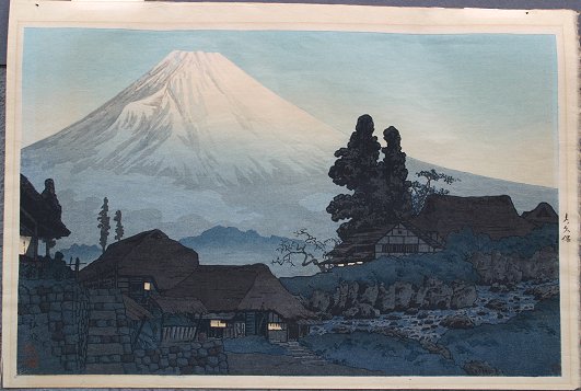MT FUJI WOODBLOCK BY TAKAHASHI SHOTEI: Size with margins 10 1/2'' x 15 1/2'', encased in a thin edge frame with wear, 16'' x 21'', bears the seal #1 lower left, gourd shape. Condition - Lightstruck; minor browning throughout.