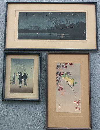 3 PIECE SHOTEI WOODBLOCKS LOT TO INCLUDE ''STREET MUSICIANS'', ''BIRDS ON MAPLE'' AND ''COUNTRY BY STARRY NIGHT'': Call for condition and measurements.