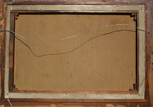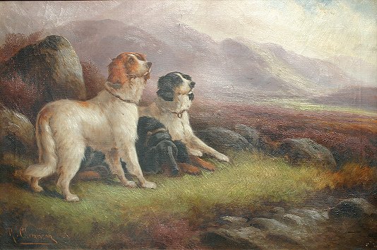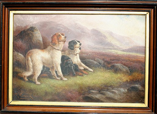 CLEMINSON, Robert, (British, 19th/20th C): Three dogs and a highland landscape, O/C, 16'' x 24'', encased in a period ebonized walnut frame with wear, 21'' x 28''. Condition - Needs cleaning, minor pinhole in upper margin.