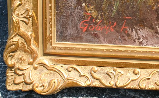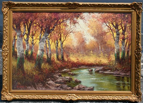 HUNGARIAN? AUTUMNAL STREAM: O/C, 24'' X 36'', signed lower left Gooris?, encased in gold carved frame with wear, 25'' x 41''.