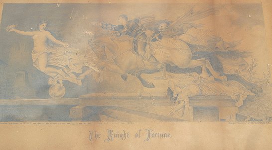 ''THE KNIGHT OF FORTUNE'' PENCIL DRAWING BY L.C. LUTZ: Dated 1872, Sight size 20'' x 31 1/2'', encased in a period wooden frame with wear, 23 1/2'' x 35''. Condition - Browning throughout with spots in image, tears in the margins. Sold as is.