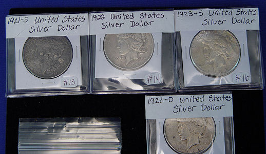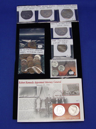 ASSORTED UNITED STATES COINAGE: To include, Silver Dollars - 1921-S Morgan, 1922 & 1922-D Peace, 1923-S Peace; two 1981 Kennedy half dollars sealed as uncirculated in commemorative card; 53 assorted pennies to include wheat, steel and Indian cents. Also a 1918 Canadian large cent. All sold as a lot.