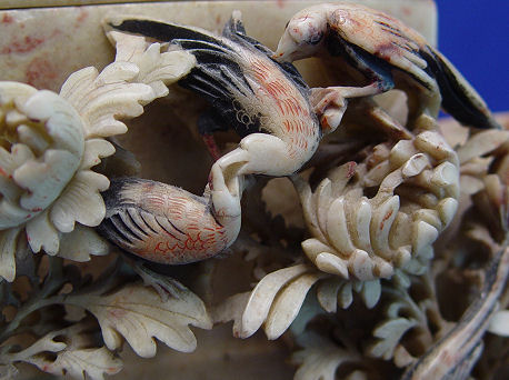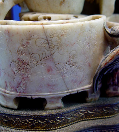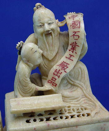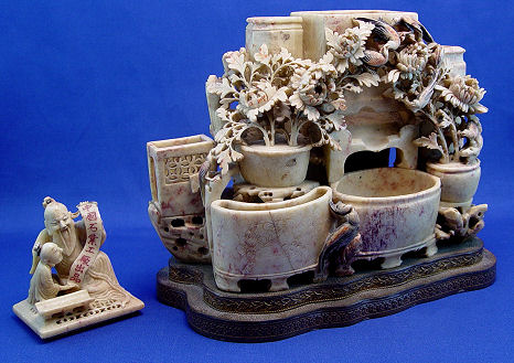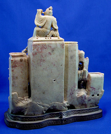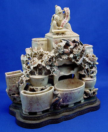 LARGE SOAPSTONE VASE STATUE: Multi level with five vases or brush holder wells. Topped by a covered box with scholar figure lid. Please note the lid has been repaired. Mounted on a reticulated metal base. 12''h. x 11''