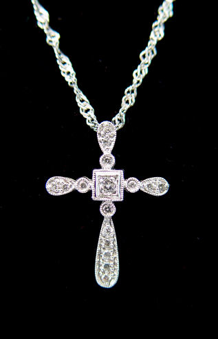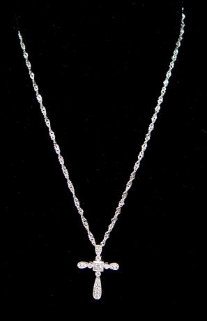 14k DIAMOND CROSS PENDANT: Delicate lobed cross pendant of white gold set with round cut diamonds, 1'' x 3/4'', 24'' twisted rope chain, 4.5 grams. Est. $300/500**
