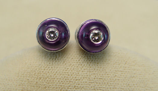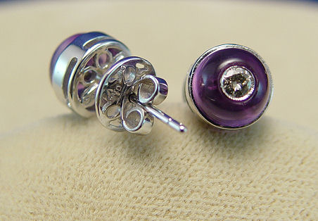ADORABLE AMETHYST AND DIAMOND EARRINGS: Amethyst domes of approx. 4ct total each centered by a full cut diamond of approx. .09ct. Set in 18k white gold post earrings with large backs. 4 grams total. Est. $300/400**