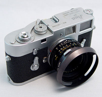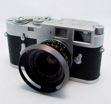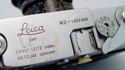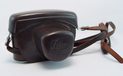 LEICA M2 CAMERA: Includes flash unit, 90mm lens (Ernst Leitz), 2 Kalimar lenses, lens covers, pocket guide and Leica camera equipment catalogs. In leather cover, appears to be in working order.
