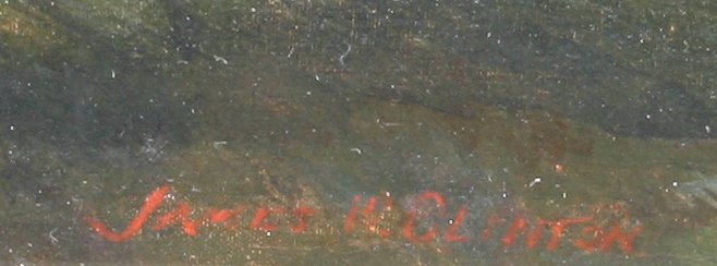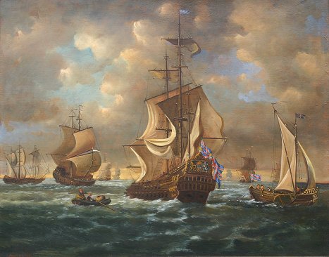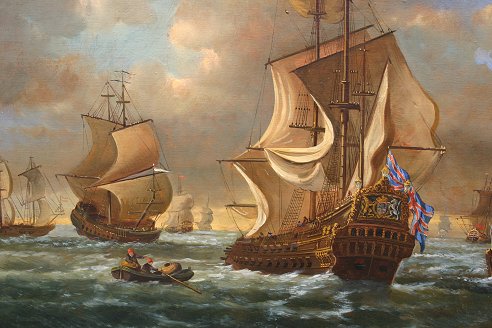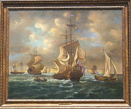 CLINTON, James W., (European, 19th C): Armada at sea, O/C, 32'' x 39 1/2'', signed lower left, gilded frame with wear, 37 1/2'' x 45 3/4''. Condition - Re-lined, sporadic in-painting throughout, professionally restored and ready to hang.